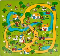 Descoperiți salteaua distractivă din spumă cu motivul viața la țară, care creează un spațiu sigur și stimulant pentru copii. Din ea veți asambla o suprafață de joc pătrată cu drumuri, iazuri, copaci, clădiri, moară de vânt, animale, vehicule și personaje – decorul perfect pentru jocul cu figurine.