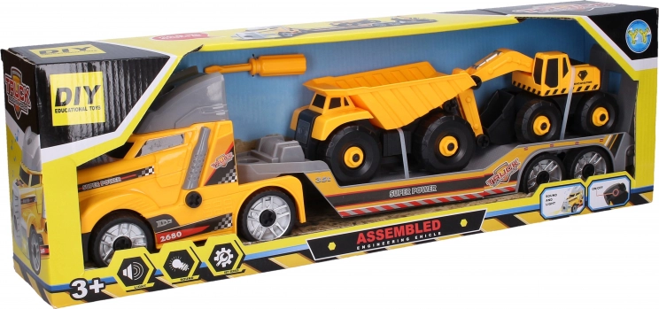 - Set complet: autotren, basculantă, excavator și șurubelniță în cruce cu cheie integrată în mâner.