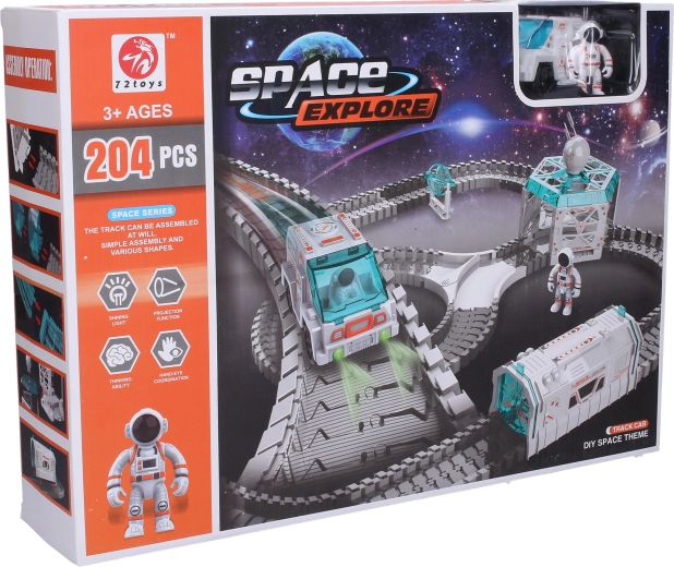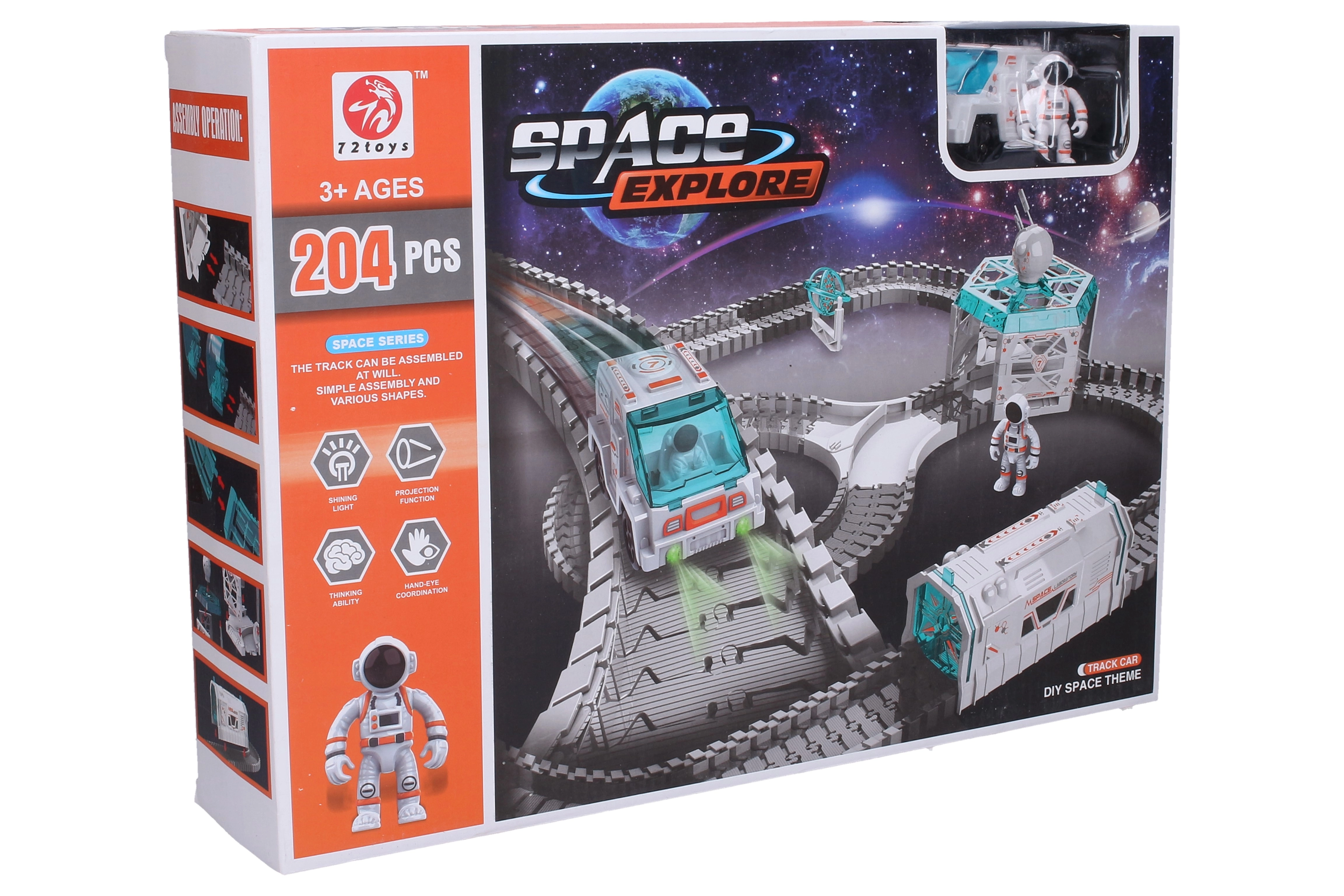 Descoperă aventura în spațiu cu această pistă cosmică de curse cu dimensiunile 85 × 75 × 32 cm. Include un autoturism, o figurină astronaut și un proiector funcțional cu efecte luminoase. Pista poate fi asamblată liber în forme diferite, astfel încât distracția nu se termină niciodată.