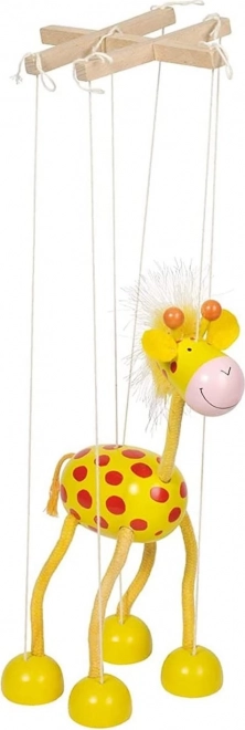 Marioneta este prinsă cu șnururi subțiri de o cruce de ghidaj din lemn.