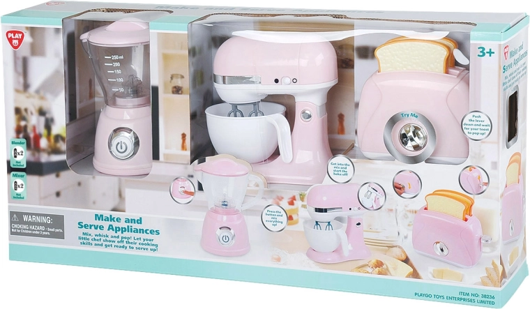 Setul de 3 electrocasnice de jucărie Playgo aduce distracție realistă în orice bucătărie de copii. Într-un design modern roz, copiii pot imita în siguranță adulții și își pot antrena motricitatea fină, creativitatea și abilitățile sociale. Fiecare aparat este conceput să arate și să funcționeze ca unul real, inclusiv cu efecte luminoase și sonore.