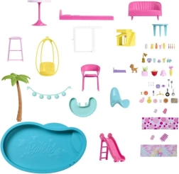 Spațiul special pentru animăluțe dispune de un tobogan și o piscină, unde împreună cu Barbie pot crea scenarii amuzante pentru micile animale. Include și căsuțe și culcuș.