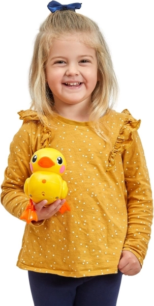 Rățușca se leagănă pe uscat și alunecă lin în apă – o mișcare realistă pe care copiii o adoră.