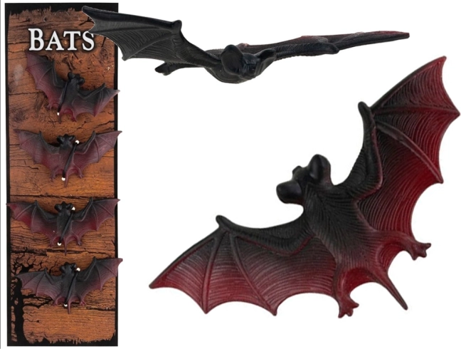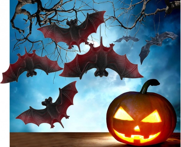 Creează o atmosferă înfricoșătoare de Halloween în câteva clipe! Acest set de 4 lilieci realiști din plastic/cauciuc rezistent este ideal pentru decorarea casei, grădinii și petrecerilor. Pur și simplu agăță-i de o creangă, pânză de păianjen sau poliță și obții decorațiuni spectaculoase cu aripi negre‑roșii accentuate.