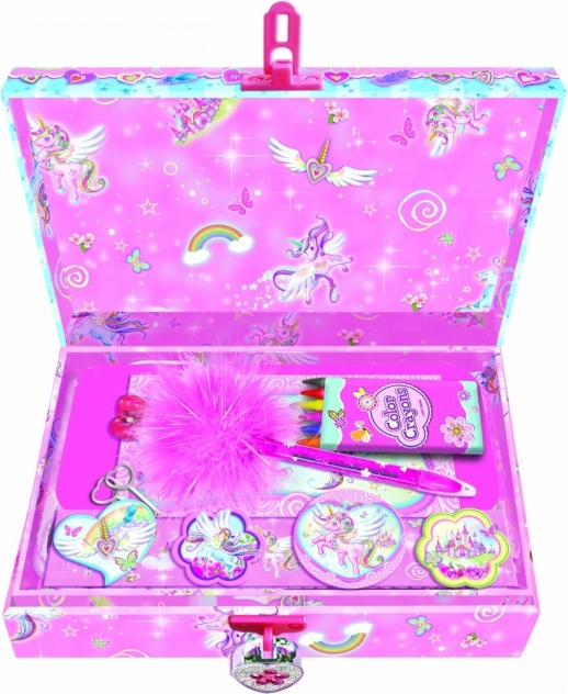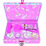 Acest set fermecător îmbină distracția cu ordinea: copiii își pot păstra secretele în cutia de bijuterii ce se poate încuia și pot scrie scrisori sau bilețele în setul de corespondență. Motivul delicat cu unicorni va încânta toți iubitorii poveștilor magice și ai culorilor pastelate.