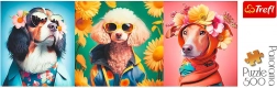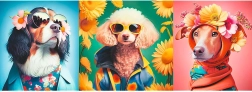 Trei câini îmbrăcați cu stil, cu ochelari de soare și flori, pe un fundal colorat, creează o imagine jucăușă care va însufleți orice interior.