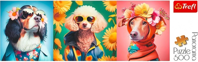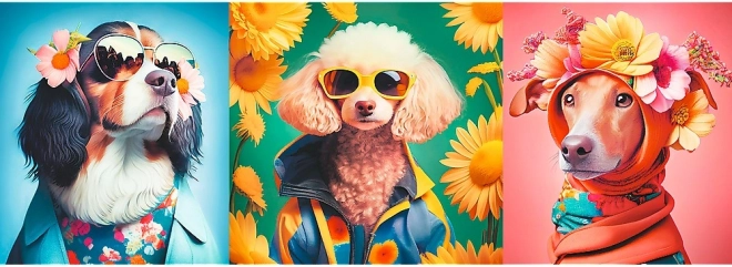 Descoperiți lumea jucăușă a unei prezentări de modă canine, în culori vibrante și într-un format panoramic impresionant. Câinii îmbrăcați cu stil, cu ochelari de soare și flori, transformă asamblarea într-o experiență distractivă, iar imaginea finală devine o decorațiune originală.