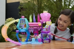 Intrați în lumea Trolls Mount Rageous cu adorabila păpușă Poppy, patru Hair Pops și peste 25 de accesorii pentru povești nesfârșite. Setul de joacă pe două niveluri, cu tobogan, colț de bar, vestiar și scenă, oferă multă distracție interactivă, inclusiv lansatorul de Hair Pops – glisați bijuteria și priviți cum zboară Hair Pops! Perfect pentru joaca creativă a copiilor de la 3 ani.