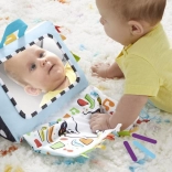 - Joacă senzorială pe toate laturile: oglindă mare pentru explorarea expresiilor feței, panou foșnitor, etichete moi atârnate și modele contrastante