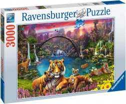 Cutia puzzle-ului ilustrează o scenă cu tigri într-un peisaj vibrant, plin de verdeață și animale sălbatice.