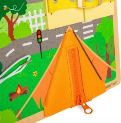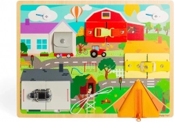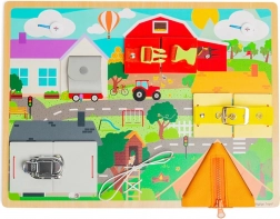 Descoperă o jucărie distractivă și educativă pentru copii de la 3 ani – o placă motrică cu diverse încuietori, catarame și fermoare, care dezvoltă motorica fină, coordonarea mână-ochi și abilitățile practice. Fiecare deschidere dezvăluie o scenă ascunsă și stimulează creativitatea și curiozitatea. Fabricată din lemn certificat FSC, prietenos cu natura.