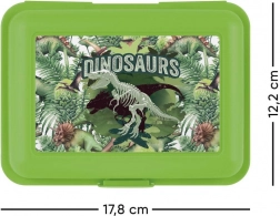 Cutie de prânz BAAGL Dinozauri în culoarea verde este alegerea ideală pentru copii datorită designului său atractiv cu dinozauri și a execuției practice cu un separator interior.