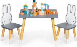 Pe masă, copiii pot desena, construi turnulețe din blocuri și lucra la alte proiecte creative. Blocurile colorate nu sunt incluse în set, dar pot fi achiziționate separat.