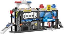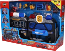 Setul bogat de accesorii extinde posibilitățile de joc: nu lipsesc 2 mașini de poliție cu roți cu rulare liberă, semnalizare rutieră, extinctor, spălătorie auto, stație de alimentare și diagnosticare. Totul este gata de utilizare imediată, deoarece 3× baterii AG13 sunt incluse în pachet.