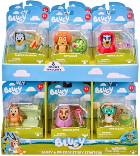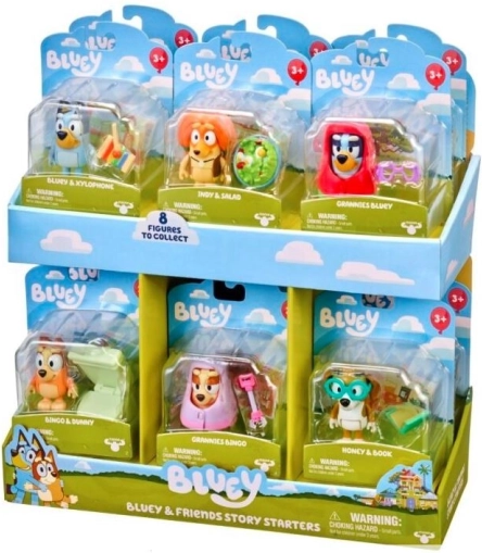 Plonjează în lumea Bluey și alătură-te aventurilor sale cu prieteni precum Bingo, Honey, Snickers, Indy și Muffin. Fiecare set "Începutul jocului" este tematic inspirat din episoadele serialului Bluey și conține accesorii pentru fiecare personaj. Fiecare ambalaj include și o mini carte poștală drăguță cu un motiv din serial.