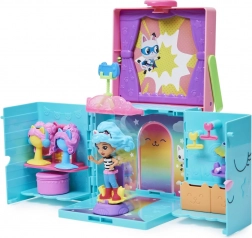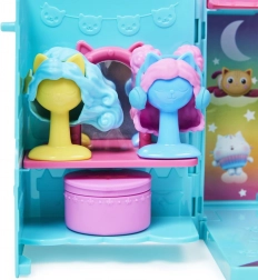 Pregătește-o pe Gabby pentru o ședință foto de vedetă la măsuța de toaletă cu oglindă, trei peruci stilate și două suporturi. În dulapul cu umerașe și sertare alege dintre două ținute, așază păpușa pe podiumul rotativ și dă startul defilării pe podium. La finalul zilei, depozitezi totul la loc, închizi și iei cu tine grație mânerului practic.