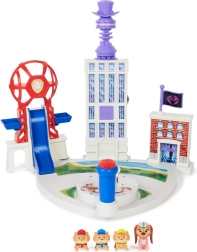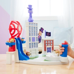 Pregătește-te să salvezi Adventure City alături de Liberty și Cățeii Tineri! Primarul Humdinger și Vee pun ceva la cale, iar Liberty și Cățeii Tineri trebuie să-i oprească! Acest set include un turn miniatural al Patrulei Cățelușilor și diverse ținte pe orizontul Adventure City. Ține de tine ca, folosindu-te de lansatorul tău de căței din Cățeii Tineri, să-l oprești pe Vee și pe primarul Humdinger și să salvezi situația! Începe prin a așeza unul dintre membrii Cățeilor Tineri pe platforma de start. Când este pregătit, trage de el și rotește catapulta pentru căței la stânga și la dreapta, vizând cele 3 locuri prestabilite! Apasă butonul roșu de pe mânerul lansatorului pentru a lansa unul dintre căței spre uriașa icoană a jobenului de pe cea mai înaltă clădire, apoi va apărea grafica uriașă a primarului Humdinger. În acel moment, lansează al doilea cățel pentru a-l scoate din drum! După ce termini prima parte, plasează al treilea cățel în lansator, țintește vârful clădirii din extrema dreaptă și încearcă să îl lovești, doborând astfel ușa celulei de închisoare din fața clădirii și capturându-l pe Vee! Finalizează toate cele trei părți și salvează situația! Este o distracție grozavă! Acest set de joacă distractiv include, de asemenea, un tobogan uriaș cu rampă în fața turnului Patrulei Cățelușilor, exact ca în film, plus sala de control și mai multe zone de joacă în care poți reinterpreta scenele tale preferate din filmul Patrula Cățelușilor: Marele film! Cu jucăriile din lumea Patrulei Cățelușilor, copilul își poate dezvolta imaginația și abilitățile motorii în timp ce retrăiește scenele preferate din film! Pentru misiuni și mai distractive și pline de suspans, inspirate de serialul Patrula Cățelușilor, colectează toate jucăriile din filmele Patrulei Cățelușilor, cum ar fi uimitorul portavion de comandă, și toate jucăriile din edițiile speciale Patrula Cățelușilor pentru fete și băieți, precum figurinele și seturile de joacă Mighty Pups, Aqua Pups și Big Truck Pups (fiecare se vinde separat). Bucură-te de aventuri nesfârșite cu setul de joacă Liberty și Cățeii Tineri din filmul Patrula Cățelușilor: Marele film!