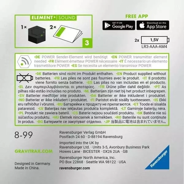 Extindeți pista dvs. de bile GRAVITRAX cu modulul Power Sound și adăugați-i efecte sonore impresionante. După primirea semnalului pornește sunetul de acțiune și puteți comuta între lumi sonore – de la junglă până la spațiu. Cu un singur buton setați și muzică ambientală de fundal. Modulul dezvoltă creativitatea, susține interesul pentru fizică, geometrie spațială și gravitație și este grozav atât pentru copii, cât și pentru adulți.