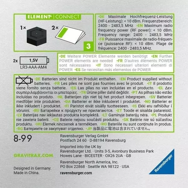 - Compatibilitate – funcționează cu celelalte elemente din gama GraviTrax; pentru utilizare sunt necesare și alte elemente Power.