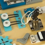 - lampă, spinner, rotițe dințate, sonerie, 2× cheie, lacăt cu cheie, ștecher metalic, fermoar, clopoțel pe șnur, curea cu cataramă, mărgele ca la abac, 2× mașinuță, 2× imagine ascunsă, cârlig de închidere