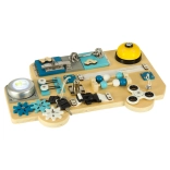 - Dotare bogată: lampă pe baterii, spinner, rotițe dințate, sonerie, 2 chei și lacăt, ștecher metalic, fermoar, clopoțel pe șnur, curea cu cataramă, biluțe ca la abac, 2 mașinuțe glisante și 2 imagini ascunse, cârlig de închidere.