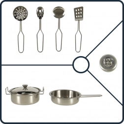 - Accesorii incluse: Setul vine cu un set de vase din metal, inclusiv o tigaie și un vas, plus alte ustensile (4 bucăți).