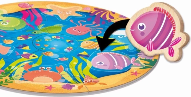 Puzzle rotund din lemn destinat pentru dezvoltarea simțului tactil și abilităților logice. Perfect pentru copii de la 1 an.