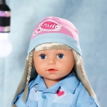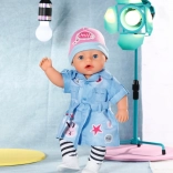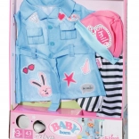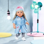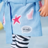 Rochie-cămașă stilată pentru păpușa BABY born de 43 cm, cu look denim lejer și detalii elegante. Setul include rochie cu curea, colanți în dungi, căciuliță roz și adidași albi. Ideal pentru joacă creativă și schimbat ținute, cu accent pe execuție de calitate, îmbrăcare comodă și accesorii bogate.