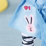Îmbracă-ți păpușa în rochia-cămașă trendy în stil denim, care combină un look lejer cu elemente elegante. Răsfrângerea jucăușă a mânecilor, gulerul simetric, buzunarele aplicate și cureaua de legat sunt completate de imprimeuri drăguțe în stil ecusoane. Sub rochie se potrivesc perfect colanții alb-negru în dungi, iar ținuta este completată de căciulița roz și adidașii albi.