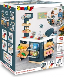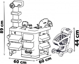 Supermarket cu casă de marcat, departament de fructe/legume, cântar (cântar mecanic nou: greutatea afișată se ajustează în funcție de alimentele cântărite). Copilul poate seta ceasul și panoul deschis/închis. Include 42 accesorii: paste, biscuiți, cereale, lapte, 6 bucăți de fructe și legume, 1 tartă, 2 macarons, 2 conserve, 1 scanner electronic de coduri de bare cu sunet și lumină, 1 card de credit, 4 bonuri, 9 monede și 12 bancnote. Casa de marcat are sertar pentru bani, microfon și cititor de carduri de credit. Cărucior inclus.