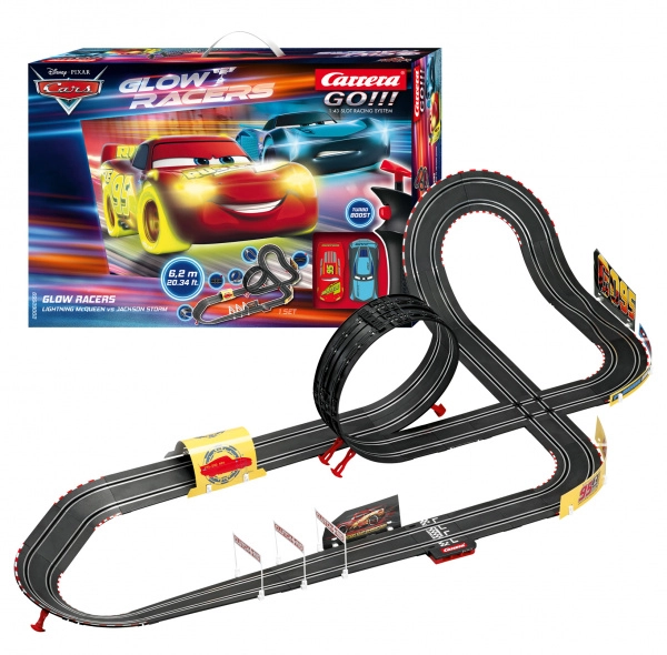 Distracție în familie și adrenalină pură de curse – aceasta este CARRERA GO în ediția Disney-Pixar Cars. Două mașini realizate cu detalii fine, Fulger McQueen și Jackson Storm în versiunea GLOW Racer, strălucesc pe un traseu plin de provocări: looping, perete vertical și viraje înclinate, stăpânite cu ușurință datorită magnetului și periilor de contact duble. Pentru un sprint imediat spre conducere servește funcția Turbo de pe ambele controllere.