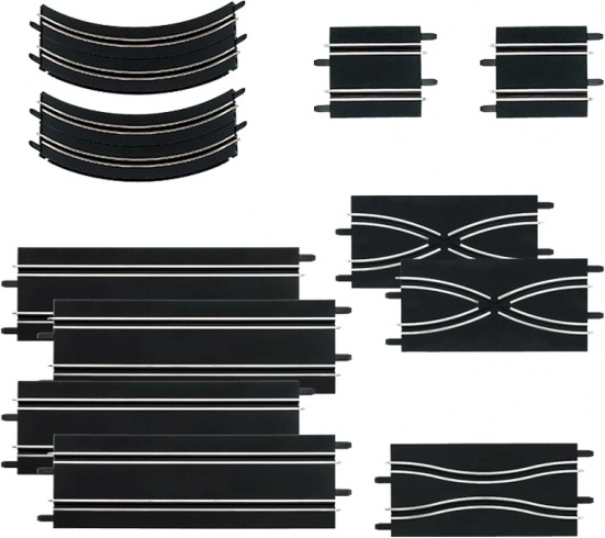 - 4× segment drept 342 mm, 2× intersecție, 1× șicană, 2× piese pentru perete vertical, 2× segment drept 114 mm
