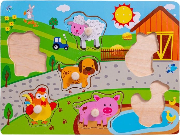 O puzzle din lemn distractiv și sigur, cu tematică de fermă, îi va încânta pe cei mai mici. Piesele cu imagini precum găinușă, pisicuță, cățel, oiță sau rață au mânere mari pentru prindere și plasare ușoară. Culorile sunt vii și prietenoase și susțin dezvoltarea motricității fine, abilităților cognitive și diferențierea formelor și culorilor.