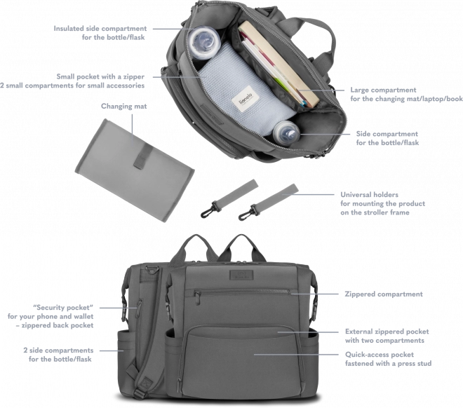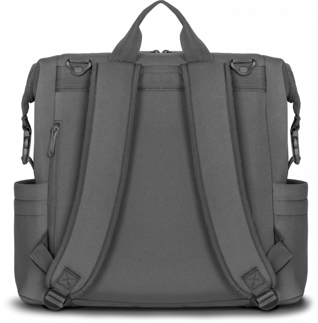 Compartimentarea gândită cu atenție oferă acces rapid la toate lucrurile esențiale pentru bebeluș și părinți. Cataramele universale permit prinderea ușoară de cărucior, iar chingile auxiliare ajustează dimensiunea astfel încât rucsacul să încapă și sub scaunul din avion.