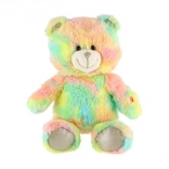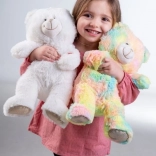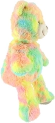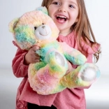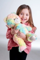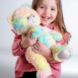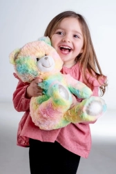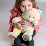 Jucăria din pluș, cu blana sa colorată ca un curcubeu, atrage privirea și impresionează nu doar prin aspect, ci și prin moliciunea la atingere.
