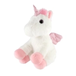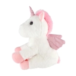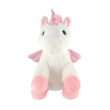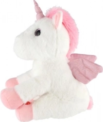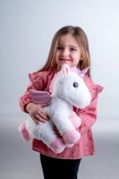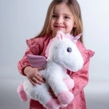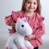 Unicorn de pluș cu blană albă fină și detalii roz, ideal pentru îmbrățișare și alinare.