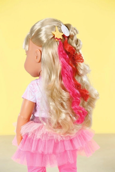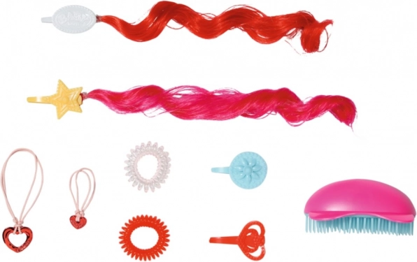 Părul lung blond poate fi stilizat cu accesoriile incluse, incluzând elastice spiralate și șuvițe colorate.