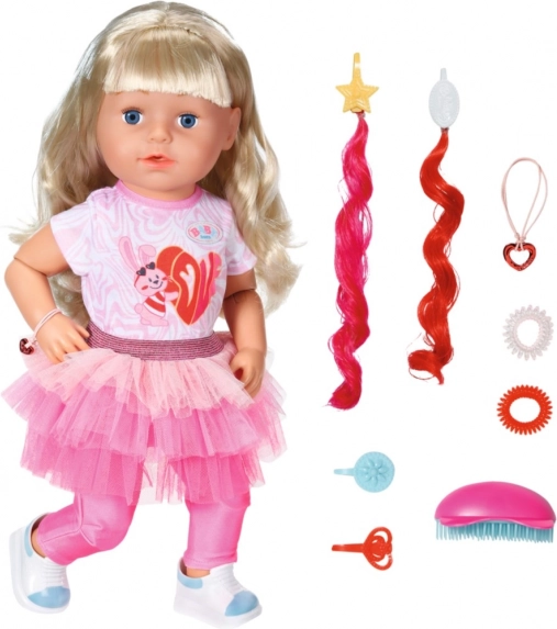 Jucați-vă cu surioara mai mare BABY born, care oferă șapte funcții realiste incredibile, asigurând ore de distracție. Păpușa este pregătită pentru orice aventură datorită articulațiilor sale, care îi permit să ia diverse poziții și mișcări. Părul său lung blond așteaptă să fie aranjat cu ajutorul accesoriilor de păr incluse în pachet.