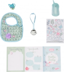 Setul include de asemenea suzeta, biberon, bavetă, colier și album pentru copii cu o foaie de autocolante, permițând personalizarea și dezvoltarea creativității în mediul de joc.