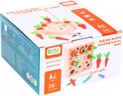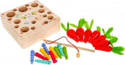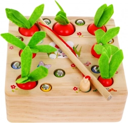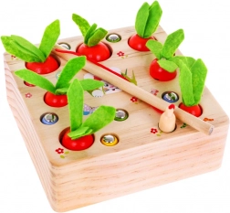 Jocul din lemn cu morcovi este conceput pentru a stimula curiozitatea și a susține dezvoltarea motricității fine și coordonarea mână-ochi. Copiii pot învăța recunoașterea formelor și culorilor și își pot îmbunătăți abilitățile cu undița magnetică. Acest joc este ideal pentru joc individual sau de grup. Cu ajutorul undiței magnetice, copiii trebuie să scoată toți viermii, apoi să adune morcovii pentru a proteja legumele care cresc.