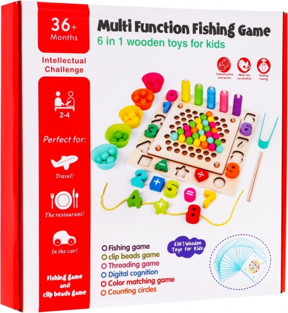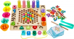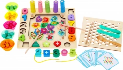 | | Această jucărie este destinată copiilor de la trei ani. Conține 6 propuneri de joc pentru cei mai mici. Pescuit cu undiță Copilul are sarcina să prindă un pește sau altă creatură marină cu o undiță cu magnet, antrenând coordonarea, prinderea corectă și răbdarea. Joc cu mărgele după model de pe carduriCopilul extrage una dintre cele 18 cartonașe și apoi încearcă să reproducă modelul de pe cartonaș pe planșa cu găuri, antrenând percepția vizuală, motricitatea grosieră, coordonarea mână-ochi, dezvoltând memoria și orientarea spațială. Potrivirea literelor și cifrelor Copilul potrivește literele și cifrele în adânciturile corespunzătoare de pe planșă, exersând spiritul de observație, dobândind abilități de orientare în spațiu și dezvoltând îndemânarea manuală. Potrivirea culorilor Copilul pune inele colorate pe bețișoare, încercând să obțină zece inele identice pe fiecare bețișor, exersând astfel coordonarea mână-ochi și prinderea corectă. Înșirarea literelor și cifrelor pe șnur Copilul încearcă să înșire literele și cifrele pe șnur, dezvoltând motricitatea, îndemânarea, creativitatea și răbdarea. Coșulețe colorate Copilul introduce bile colorate în formele pentru coșulețe, încercând să aibă în fiecare formă bile de aceeași culoare, învățând să recunoască culorile și dezvoltând motricitatea și orientarea spațială. Jucăria este în întregime din lemn, deci este durabilă și sigură pentru copil. |