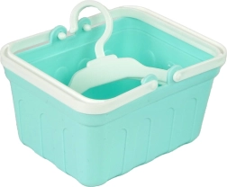 Coșul practic cu mâner facilitează transportul rufelor, iar cele două umerașe ajută la păstrarea ordinii – accesoriul ideal pentru un joc realist.