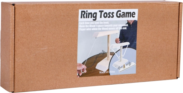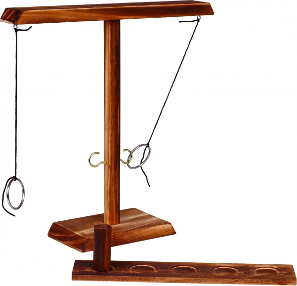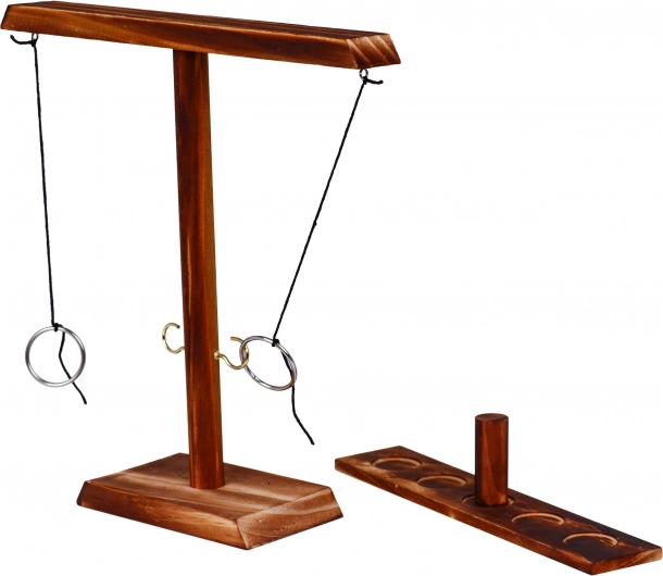 | Joc din lemn, de îndemânare, captivant, pentru copii de la 5 ani, dar și pentru adulți. Excelent pentru petreceri, teambuildinguri, vacanțe. Oferă ore întregi de distracție și îmbunătățește coordonarea mână-ochi. Se asamblează și se demontează ușor, este realizat cu grijă și este absolut unic. Este un joc tradițional în care arunci inelul astfel încât să ajungă pe cârlig. După fiecare aruncare reușită, trebuie să muți țărușul de pe bază, cu inele, către adversar. Cine ajunge primul la adversar câștigă. Rețineți că, în varianta pentru adulți, țărușul poate fi înlocuit cu un păhărel. Principiile jocului: - plasați țărușul din lemn în centrul plăcii, - încercați să nimeriți inelul metalic astfel încât să se așeze pe cârlig, - când reușiți, mutați țărușul din lemn cu 1 poziție către adversar, - când ratați, este rândul adversarului, - cine ajunge primul la adversar, câștigă. |
