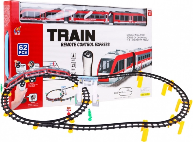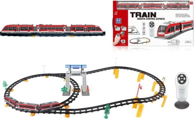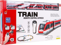 | | Setul mare de tren cu șine este destinat copiilor de la 3 ani. Pachetul conține 62 de elemente, iar lungimea traseului este de până la 396 cm. Trenul este controlat cu telecomandă, se deplasează în sensul sau invers sensului acelor de ceasornic. Trenul emite sunete de rulare și aprinde farurile din față sau din spate în funcție de direcția de mers. Jucăria este alimentată cu baterii AA - 2 x 1,5 V (telecomandă) și 3 x 1,5 V (tren). | |