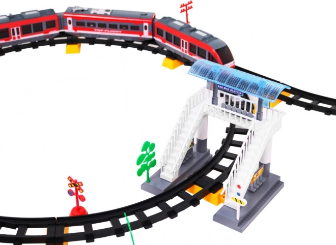 | - 3 x locomotivă, - segmente drepte de șină, - segmente curbe, - traverse pentru șine, - clădirea gării, - elemente decorative precum copaci, indicatoare. | ||