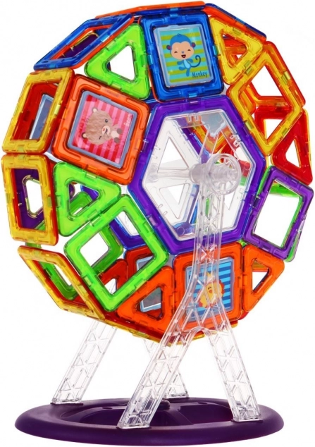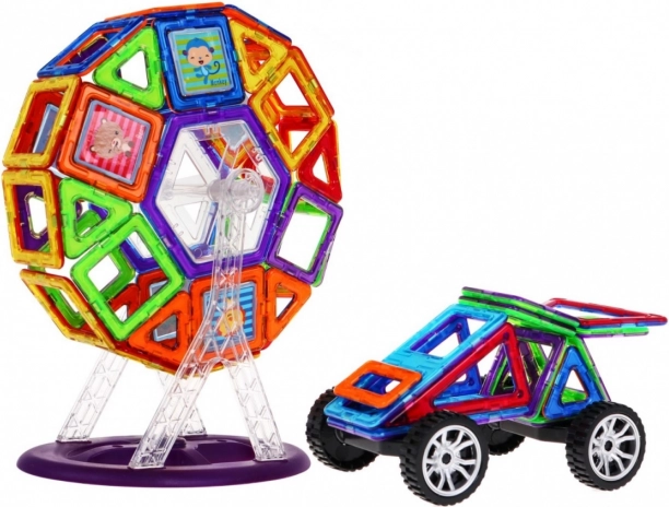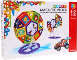 | - 56 de bucăți de cuburi magnetice colorate de forme diferite (dreptunghiuri, triunghiuri, trapeze, pătrate etc.), - 42 de blocuri din plastic – umpluturi (pătrate), - bază pentru carusel, - 2 laterale care susțin caruselul și îi permit rotirea, - 2 axe pentru roți, - 4 roți, - 3 coli cu autocolante colorate - mostră cu modele de exemplu pentru puzzlurile tip carusel și mașinuțe, - ambalaj colorat estetic, ideal pentru cadouri | |