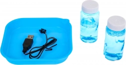 - Pistolă de făcut bule, 2× rezervă pentru bule, acumulator 3,7 V, autocolante, curea, cablu USB, vas pentru lichid