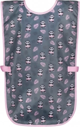 Șorțul pentru copii cu motiv panda este conceput pentru a proteja copiii în timpul diverselor activități. Are o bază gri cu elemente de diferite culori care arată jucăuș și elegant.
