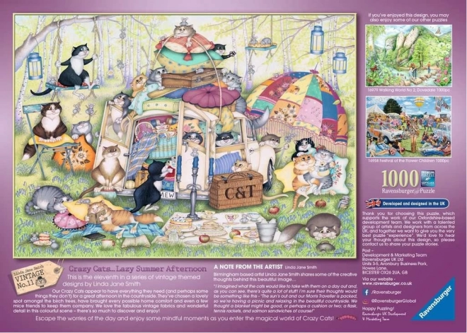 Bucurați-vă de momente liniștite cu puzzle-ul de 1000 de piese din seria CRAZY CATS. Motivul „După-amiază de vară leneșă” îi va încânta pe iubitorii de pisici și de umor, iar după asamblare veți obține o imagine de cca 70 × 50 cm, cu execuție de calitate și piese precise.
