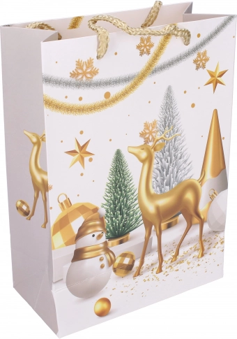 Geantă cadou de Crăciun frumoasă de mărimea L (31x40x12 cm) pentru ambalarea perfectă a cadourilor, disponibilă în patru motive diferite.